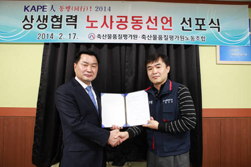 축산물품질평가원 노사는 상생협력 노사공동선언을 통해 최근 정부에서 추진하는 공공기관 방만경영 정상화 추진 계획의 성실한 이행으로 타기관의 모범이 되고자 하였으며 일하는 직장분위기 조성과 적극적인 경영효율화 실천을 통해 생산성 향상과 불합리한 노사관행을 적극 발굴·개선하고 청렴한 업무처리를 바탕으로 신뢰받는 기관이 될 것을 다짐하였다.