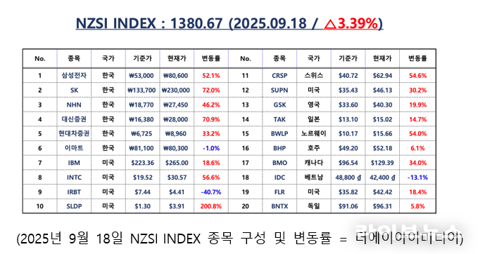 공정 투자 기준형 지수인 NZSI INDEX는 이날 3.39% 오른 1,380.67포인트를 기록하며 3일 연속 약세 흐름을 마감하고 상승 전환에 성공했다. 이 지수는 한국과 글로벌 대표 종목의 실질 수익률을 반영해, 기존 시가총액 중심 지수의 한계를 보완하는 투자 기준 역할을 강조한다.