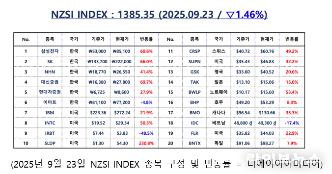 공정 투자 기준형 지수인 NZSI INDEX는 이날 1.46% 하락한 1,385.35포인트를 기록하며 3일 연속 상승 흐름을 멈추고 하락 전환했다. 이 지수는 한국과 글로벌 대표 종목의 실질 수익률을 반영해, 전통적인 시가총액 중심 지수가 놓치기 쉬운 수익률 간 편차를 보완하는 기준으로 기능한다.