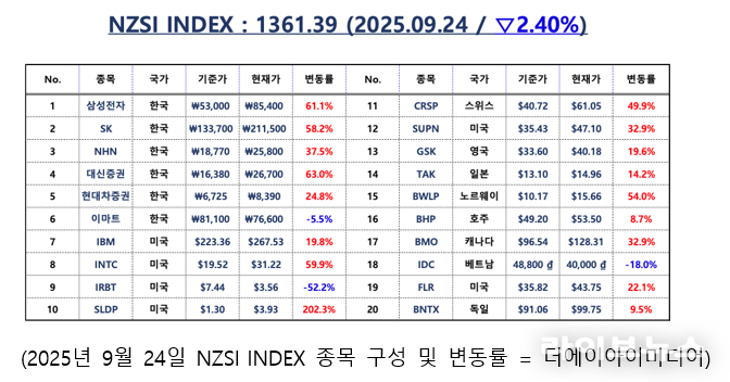공정 투자 기준형 지수 NZSI INDEX는 이날 2.40% 하락한 1,361.39포인트를 기록하며 2일 연속 하락 흐름을 이어갔다. 이 지수는 한국과 글로벌 대표 종목의 실질 수익률을 반영해, 전통적 시가총액 중심 지수가 간과하기 쉬운 수익률 간 편차를 보완하는 기준으로 기능한다.