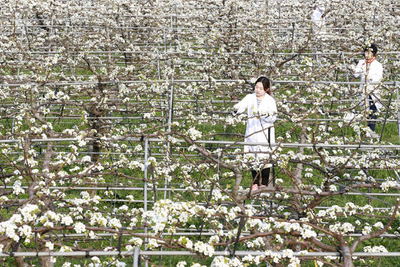 12일 오후 나주시 금천면 농촌진흥청 국립원예특작과학원 배연구소 시험장에서 연구원들이 만개한 배꽃 사이로 시험연구를 위한 인공수분작업을 하고 있다.
