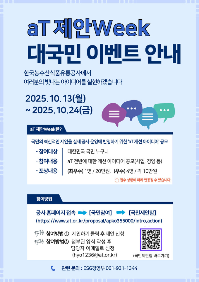 한국농수산식품유통공사(사장 홍문표)는 사업과 경영 개선을 위한 국민 아이디어를 발굴하기 위해 24일까지 ‘aT 제안 Week(집중제안주간)’를 진행한다고 14일 밝혔다.