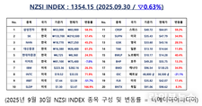 언론 통합 플랫폼이자 인터넷신문사 제보팀장을 운영 중인 더에이아이미디어는 9월 30일 NZSI INDEX 기반 시황 보고서를 발표했다. [편집자주] NZSI INDEX는 왜곡된 시장 정보에서 벗어나, 개인 투자자를 위한 공정하고 실질적인 투자 기준을 제시합니다. NZSI INDEX에는 미래를 설계할 수 있는 자본시장의 가능성이 담겨 있습니다. ★ 지수변경 : 1,000을 기준으로 종목 기여도 동일 반영 ★ 기 준 가 : 2024. 12. 20 / 1차 개편 : 2025. 04. 01 ★ 평가기준 : 20개 종목 X 5개 항목 (건전성, 안전성, 성장성, 위험도, 기대값) X 10등급 (A3 ~ D) 2025년 9월 30일, 국내 증시 코스피 지수는 전 거래일 대비 0.19% 내린 3,424.60포인트로 마감했고, 코스닥 지수도 0.56% 하락한 841.99포인트로 장을 마쳤다. 거래대금은 코스피 약 11조 원, 코스닥 약 6조 7천억 원 수준으로 전일과 유사한 흐름을 보였고, 시가총액은 코스피 2,800조 3천억 원, 코스닥 437조 7천억 원으로 집계됐다. 상승 종목이 많아졌고, 중·소형주 중심 매수 흐름이 복귀한 모습도 확인된다. 글로벌 시장 미국 뉴욕