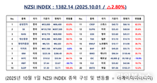 언론 통합 플랫폼이자 인터넷신문사 제보팀장을 운영 중인 더에이아이미디어는 10월 1일 NZSI INDEX 기반 시황 보고서를 발표했다. [편집자주] NZSI INDEX는 왜곡된 시장 정보에서 벗어나, 개인 투자자를 위한 공정하고 실질적인 투자 기준을 제시합니다. NZSI INDEX에는 미래를 설계할 수 있는 자본시장의 가능성이 담겨 있습니다. ★ 지수변경 : 1,000을 기준으로 종목 기여도 동일 반영 ★ 기 준 가 : 2024. 12. 20 / 1차 개편 : 2025. 04. 01 ★ 평가기준 : 20개 종목 X 5개 항목 (건전성, 안전성, 성장성, 위험도, 기대값) X 10등급 (A3 ~ D) 2025년 10월 1일, 국내 증시는 반등 흐름을 이어갔다. 코스피 지수는 전 거래일 대비 0.91% 상승한 3,455.83포인트로 마감했고, 코스닥 지수는 0.40% 오른 845.34포인트로 장을 마쳤다. 거래대금은 코스피 약 11조 원, 코스닥 약 6조 7천억 원 수준으로 전일과 유사한 흐름이었고, 시가총액은 코스피 2,828조 원, 코스닥 439조 5천억 원으로 집계되었다. 글로벌 시장에서도 양호한 흐름이 이어졌다. 미국 뉴욕 증시에서는 다우존스 산업평균지수