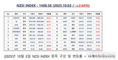 언론 통합 플랫폼이자 인터넷신문사 제보팀장을 운영 중인 더에이아이미디어는 10월 9일 NZSI INDEX 기반 시황 보고서를 발표했다. [편집자주] NZSI INDEX는 왜곡된 시장 정보에서 벗어나, 개인 투자자를 위한 공정하고 실질적인 투자 기준을 제시합니다. NZSI INDEX에는 미래를 설계할 수 있는 자본시장의 가능성이 담겨 있습니다. ★ 지수변경 : 1,000을 기준으로 종목 기여도 동일 반영 ★ 기 준 가 : 2024. 12. 20 / 1차 개편 : 2025. 04. 01 ★ 평가기준 : 20개 종목 X 5개 항목 (건전성, 안전성, 성장성, 위험도, 기대값) X 10등급 (A3 ~ D) 2025년 10월 9일은 국내 증시가 추석 연휴로 휴장했다. 미국 뉴욕 증시는 하락세를 보였다. 다우존스 산업평균지수는 0.52% 하락해 46,358.42포인트로 마감했고, 기술주 중심의 나스닥 종합지수도 0.08% 내린 23,024.63포인트를 기록했다. 공정 투자 기준형 지수인 NZSI INDEX는 이날 0.86% 하락한 1,492.91포인트를 기록하며 6거래일 연속 상승 흐름을 마무리하고 하락 전환했다. 이 지수는 한국과 글로벌 대표 종목의 실질 수익률을 반