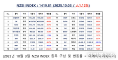언론 통합 플랫폼이자 인터넷신문사 제보팀장을 운영 중인 더에이아이미디어는 10월 3일 NZSI INDEX 기반 시황 보고서를 발표했다. [편집자주] NZSI INDEX는 왜곡된 시장 정보에서 벗어나, 개인 투자자를 위한 공정하고 실질적인 투자 기준을 제시합니다. NZSI INDEX에는 미래를 설계할 수 있는 자본시장의 가능성이 담겨 있습니다. ★ 지수변경 : 1,000을 기준으로 종목 기여도 동일 반영 ★ 기 준 가 : 2024. 12. 20 / 1차 개편 : 2025. 04. 01 ★ 평가기준 : 20개 종목 X 5개 항목 (건전성, 안전성, 성장성, 위험도, 기대값) X 10등급 (A3 ~ D) 2025년 10월 3일은 개천절로 국내 증시는 휴장했다. 미국 뉴욕 증시는 강약 혼조 속 상승 흐름을 보였다. 다우존스 산업평균지수는 0.51% 상승해 46,758.28포인트로 마감했고, 기술주 중심의 나스닥 종합지수는 0.28% 하락해 22,780.51포인트를 기록했다. 공정 투자 기준형 지수 NZSI INDEX는 이날 1.12% 상승한 1,419.81포인트로 마감하며 3거래일 연속 상승 흐름을 이어갔다. 이 지수는 한국과 글로벌 대표 종목의 실질 수익률을 반영