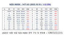 언론 통합 플랫폼이자 인터넷신문사 제보팀장을 운영 중인 더에이아이미디어는 10월 10일 NZSI INDEX 기반 시황 보고서를 발표했다. [편집자주] NZSI INDEX는 왜곡된 시장 정보에서 벗어나, 개인 투자자를 위한 공정하고 실질적인 투자 기준을 제시합니다. NZSI INDEX에는 미래를 설계할 수 있는 자본시장의 가능성이 담겨 있습니다. ★ 지수변경 : 1,000을 기준으로 종목 기여도 동일 반영 ★ 기 준 가 : 2024. 12. 20 / 1차 개편 : 2025. 04. 01 ★ 평가기준 : 20개 종목 X 5개 항목 (건전성, 안전성, 성장성, 위험도, 기대값) X 10등급 (A3 ~ D) 2025년 10월 10일, 국내 증시는 긴 추석 연휴를 마치고 긍정적인 반등세를 보였다. 코스피 지수는 전 거래일 대비 1.73% 상승한3,610.60포인트, 코스닥 지수는 0.61% 오른 859.49포인트로 장을 마쳤다. 거래대금은 코스피 약 11조 1천억 원, 코스닥 약 6조 7천억 원 수준으로 전일 대비 증가한 흐름이었고, 시가총액은 코스피 2,957조 1천억 원, 코스닥 446조 2천억 원으로 집계되었다. 미국 뉴욕 증시는 크게 흔들렸다. 다우존스 산업평