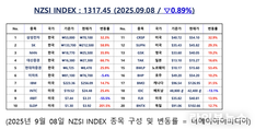 언론 통합 플랫폼이자 인터넷신문사 제보팀장을 운영 중인 더에이아이미디어는 9월 8일 NZSI INDEX 기반 시황 보고서를 발표했다. [편집자주] NZSI INDEX는 왜곡된 시장 정보에서 벗어나, 개인 투자자를 위한 공정하고 실질적인 투자 기준을 제시합니다. NZSI INDEX에는 미래를 설계할 수 있는 자본시장의 가능성이 담겨 있습니다. ★ 지수변경 : 1,000을 기준으로 종목 기여도 동일 반영 ★ 기 준 가 : 2024. 12. 20 / 1차 개편 : 2025. 04. 01 ★ 평가기준 : 20개 종목 X 5개 항목 (건전성, 안전성, 성장성, 위험도, 기대값) X 10등급 (A3 ~ D) 2025년 9월 8일, 국내 증시는 5거래일 연속 상승세를 이어갔다. 코스피 지수는 전 거래일 대비 0.45% 오른 3,219.59포인트로 마감했고, 코스닥 지수는 0.89% 상승한 818.60포인트를 기록하며 동반 강세를 보였다. 거래대금은 코스피 약 10조 9천억 원, 코스닥 약 6조6천억 원으로 전일과 큰 차이는 없었고, 시가총액은 코스피 2,631조 3천억 원, 코스닥 424조 5천억 원으로 나타났다. 해외 증시는 연방준비제도의 금리 인하 기대감에 힘입어 안