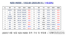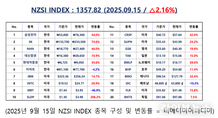 언론 통합 플랫폼이자 인터넷신문사 제보팀장을 운영 중인 더에이아이미디어는 9월 16일 NZSI INDEX 기반 시황 보고서를 발표했다. [편집자주] NZSI INDEX는 왜곡된 시장 정보에서 벗어나, 개인 투자자를 위한 공정하고 실질적인 투자 기준을 제시합니다. NZSI INDEX에는 미래를 설계할 수 있는 자본시장의 가능성이 담겨 있습니다. ★ 지수변경 : 1,000을 기준으로 종목 기여도 동일 반영 ★ 기 준 가 : 2024. 12. 20 / 1차 개편 : 2025. 04. 01 ★ 평가기준 : 20개 종목 X 5개 항목 (건전성, 안전성, 성장성, 위험도, 기대값) X 10등급 (A3 ~ D) 2025년 9월 16일, 국내 증시는 엇갈린 흐름을 보였다. 코스피 지수는 전 거래일 대비 1.24% 오른 3,449.62포인트로 마감하며 역대 신고가를 경신했다. 반면 코스닥 지수는 0.10% 하락한 852.69포인트로 약보합에 머물렀다. 거래대금은 코스피 약 10조 9천억 원, 코스닥 약 6조 6천억 원으로 전일과 큰 차이를 보이지 않았으며, 시가총액은 코스피 2,820조 6천억 원, 코스닥 442조 1천억 원으로 집계됐다. 대형주를 중심으로 강세가 나타났지만