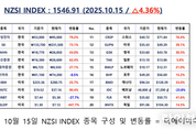 언론 통합 플랫폼이자 인터넷신문사 제보팀장을 운영 중인 더에이아이미디어는 10월 15일 NZSI INDEX 기반 시황 보고서를 발표했다. [편집자주] NZSI INDEX는 왜곡된 시장 정보에서 벗어나, 개인 투자자를 위한 공정하고 실질적인 투자 기준을 제시합니다. NZSI INDEX에는 미래를 설계할 수 있는 자본시장의 가능성이 담겨 있습니다. ★ 지수변경 : 1,000을 기준으로 종목 기여도 동일 반영 ★ 기 준 가 : 2024. 12. 20 / 1차 개편 : 2025. 04. 01 ★ 평가기준 : 20개 종목 X 5개 항목 (건전성, 안전성, 성장성, 위험도, 기대값) X 10등급 (A3 ~ D) 2025년 10월 15일, 국내 증시는 강한 상승세를 보였다. 코스피 지수는 전 거래일 대비 2.68% 오른 3,657.28포인트로 마감했고, 코스닥 지수는 1.98% 상승한 864.72포인트에서 거래를 마쳤다. 거래대금은 코스피 약 11조 2천억 원, 코스닥 약 6조 8천억 원으로 전일보다 소폭 증가했다. 시가총액은 각각 코스피 2,994조 4천억 원, 코스닥 449조 1천억 원으로 집계됐다. 대형주 중심의 급등세가 지수를 견인했고, 특히 반도체•자동차•2차전