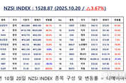 언론 통합 플랫폼이자 인터넷신문사 제보팀장을 운영 중인 더에이아이미디어는 10월 20일 NZSI INDEX 기반 시황 보고서를 발표했다. [편집자주] NZSI INDEX는 왜곡된 시장 정보에서 벗어나, 개인 투자자를 위한 공정하고 실질적인 투자 기준을 제시합니다. NZSI INDEX에는 미래를 설계할 수 있는 자본시장의 가능성이 담겨 있습니다. ★ 지수변경 : 1,000을 기준으로 종목 기여도 동일 반영 ★ 기 준 가 : 2024. 12. 20 / 1차 개편 : 2025. 04. 01 ★ 평가기준 : 20개 종목 X 5개 항목 (건전성, 안전성, 성장성, 위험도, 기대값) X 10등급 (A3 ~ D) 2025년 10월 20일, 국내 증시는 강한 상승 흐름을 보였다. 코스피 지수는 전 거래일 대비 1.76% 오른 3,814.69포인트로 마감했고, 코스닥 지수는 1.89% 상승한 875.77포인트에서 거래를 마쳤다. 거래대금은 코스피 약 11조 2천억 원, 코스닥 약 6조 8천억 원으로 전일 수준을 유지했지만, 시가총액은 각각 3,123조 5천억 원(코스피)과 455조 원(코스닥)으로 확대됐다. 지수는 이틀 연속 상승세를 이어가며, 기술적 반등이 아닌 새로운 추