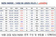 언론 통합 플랫폼이자 인터넷신문사 제보팀장을 운영 중인 더에이아이미디어는 10월 23일 NZSI INDEX 기반 시황 보고서를 발표했다. [편집자주] NZSI INDEX는 왜곡된 시장 정보에서 벗어나, 개인 투자자를 위한 공정하고 실질적인 투자 기준을 제시합니다. NZSI INDEX에는 미래를 설계할 수 있는 자본시장의 가능성이 담겨 있습니다. ★ 지수변경 : 1,000을 기준으로 종목 기여도 동일 반영 ★ 기 준 가 : 2024. 12. 20 / 1차 개편 : 2025. 04. 01 ★ 평가기준 : 20개 종목 X 5개 항목 (건전성, 안전성, 성장성, 위험도, 기대값) X 10등급 (A3 ~ D) 2025년 10월 23일, 국내 증시는 조정 흐름으로 돌아섰다. 코스피 지수는 전 거래일 대비 0.98% 내린 3,845.56포인트로 마감했고, 코스닥 지수는 0.81% 하락한 872.03포인트를 기록했다. 거래대금은 코스피 약 11조 3천억 원, 코스닥 약 6조 8천억 원으로 전일보다 소폭 증가했으며, 시가총액은 각각 3,147조 3천억 원(코스피), 453조 1천억 원(코스닥)으로 집계됐다. 이틀 전까지의 급등세 이후 시장은 숨 고르기에 들어갔다. 코스피가