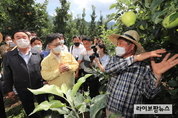 김현수 농림축산식품부 장관은 5일 오전, 경북 예천군 사과 농가를 방문하여, 추석 대비 성수품 수급 및 여름철 폭염 피해 대비 상황을 선제적으로 점검했다. 김 장관은 현장에서 폭염이 장기화되고 있어 햇볕 데임(일소) 피해로 인한 사과의 상품성 저하를 우려하며, “탄산칼슘 등 햇볕 데임 피해 경감제 살포와 가지를 유인하여 과실에 그늘을 만드는 등 적극적인 피해 예방조치를 이행하고, 관수시설과 미세 살수장치, 스프링클러 등 가용 장비를 총동원하여 과원 온도를 낮추는 등 폭염 피해에 꼼꼼히 대비할 것”을 강조했다. 특히, 김 장관은 “올해 추석에는 코로나19 장기화로 어려움을 겪고 있는 우리 국민이 넉넉한 명절을 보낼 수 있도록, 사과·배 등 성수품을 예년보다 대폭 확대 공급할 계획”이라고 밝히며, 지자체와 농협에 과실 비대 등 생육 관리와 태풍 등 추석 전에 발생할 수 있는 기상재해 변수에 대한 철저한 대비로 성수품 공급 관리와 수급 안정에 각별한 노력을 기울일 것을 지시했다. 아울러 무엇보다 농업인의 건강과 안전이 우선이라고 강조하며, 농업인은 무더운 낮 시간대를 피해 농작업을 실시하고, 지자체·농협에서는 온열 질환 방지를 위한 여름철 농업인 건강과 안전관리