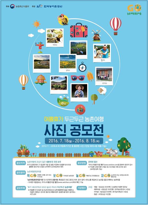 공모 주제는 ‘휴가 네GO(먹GO, 보GO, 놀GO, 자GO) 두근두근 농촌여행’으로 2015년 7월 1일부터 2016년 8월 18일까지 여름휴가 기간 중 농촌체험휴양마을을 여행하고 찍은 사진을 공모한다.