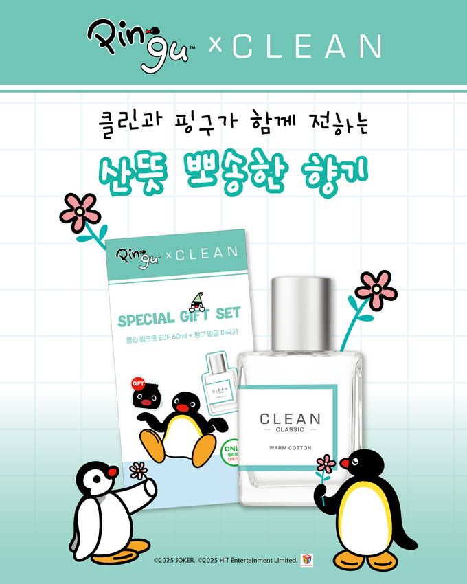 글로벌 프래그런스 브랜드 클린(CLEAN)이 세계적인 인기 캐릭터 핑구(PINGU)와 함께한 특별한 콜라보레이션 한정 세트를 선보인다. 이번 협업은 ‘깨끗하고 순수한 향기’라는 클린의 브랜드 아이덴티티와, 장난스럽고 사랑스러운 매력을 지닌 캐릭터 ‘핑구’가 만나 탄생한 시즌 한정 프로젝트다.
