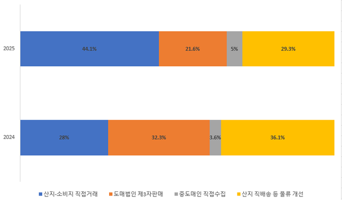 특히 청과부류의 경우 작년 산지-소비지 직거래 비중이 전체 거래 금액의 28%에서 올해 44.1%로 크게 확대되었으며, 도매시장에 반입되지 않는 직배송 비율이 65.7%에서 75.9%로 증가했다. 이는 도매거래의 유통단계 축소, 배송 효율 향상, 가격 투명성 제고 등 온라인도매시장의 경쟁력이 시장에서 실질적으로 입증된 결과로 평가된다.