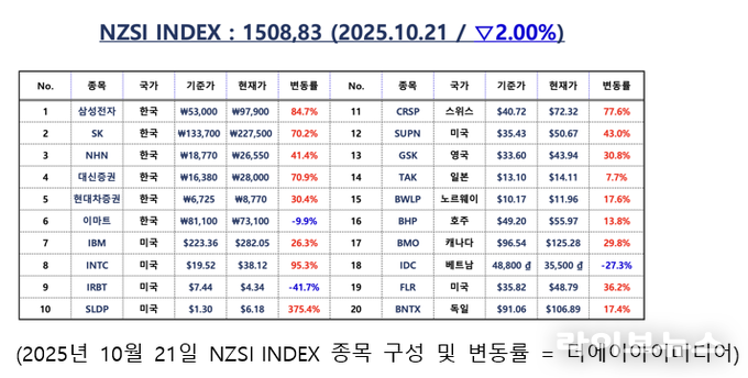 NZSI 도입 이후 누적 데이터를 보면, 한국 대표 6개 종목은 평균 49.37% 상승, 배당 포함 총수익률은 52.67%로 집계됐다. 글로벌 대표 14개 종목은 평균 51.53% 상승, 배당 포함 총수익률은 53.97%로 나타났다. 글로벌 대표 종목군이 한국 대표군의 상승률을 여전히 앞서고 있으며, 이 흐름은 최근 일주일간 꾸준히 이어지고 있다.