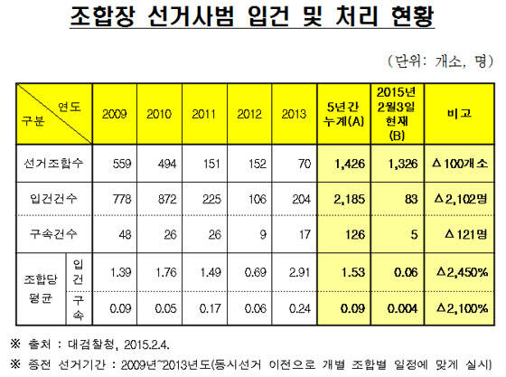 지난 4일 대검찰청 자료에 따르면 직전 선거기간인 2009년~2013년(5년) 농·수·산림협 조합장 선거는 1,426개조합에서 실시하여 2,185명이 입건되었으며 그중 126명이 구속처리 되었다.