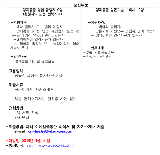 서류접수 마감일은 오는 4월 20일(금)까지로 제출서류는 국문이력서, 자기소개서, 각종 면허소지자는 면허증 사본을 첨부, 이메일(e-mail:yun-hee.lee@virbackorea.com)을 통해 접수를 받는다.