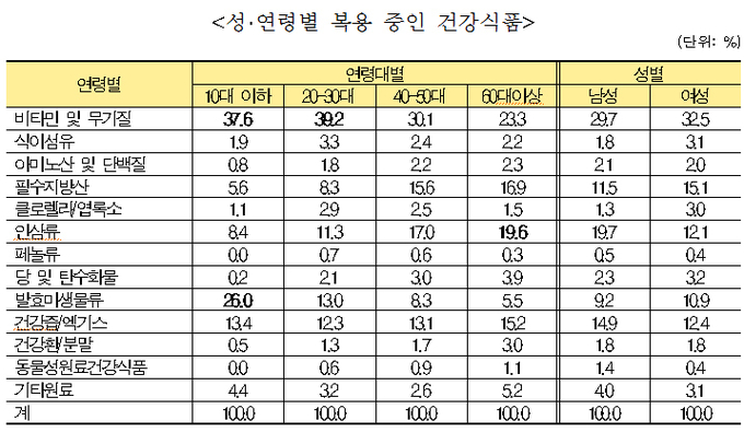 가족구성원들의 복용 중인 건강식품 종류를 설문한 결과, 비타민 및 무기질을 가장 많이 복용 중이며, 10대 이하는 발효미생물류(유산균, 프로바이오틱스)를 복용하는 비중이 26.0%로 높은 반면, 60대 이상은 인삼류(인삼, 홍삼) 비중이 19.6%로 높게 나타났다.