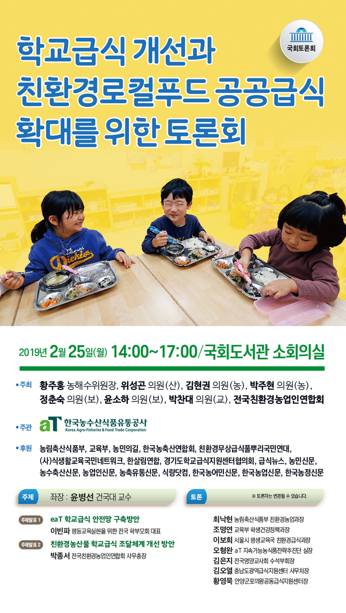 이번 토론회에서는 eaT시스템의 과제와 안전한 학교급식 식재료 공급을 위한 eaT시스템 개선방안이 발표될 예정이다.