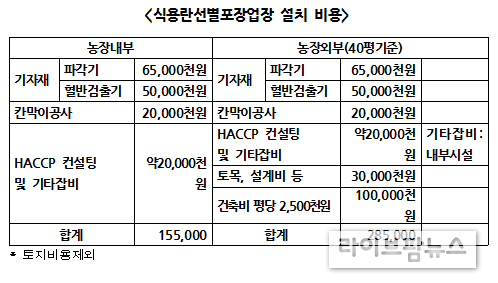 실제로 식용란선별포장업의 농장 내부 및 외부 설치 시 초기 투자비용이 최소 150∼280백만원이 소요될 것이란 주장이다.