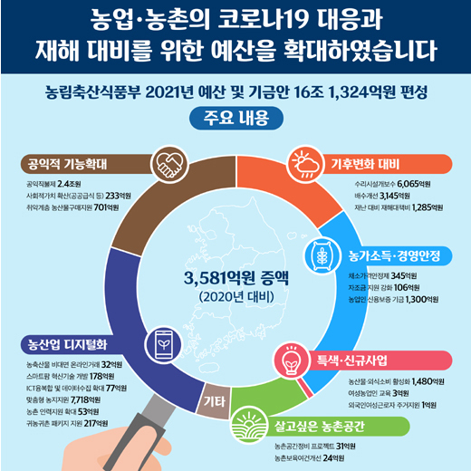 농식품부는 “코로나19로 인한 경제·사회 구조 변화에 적극 대응하고, 사람과 환경 중심의 농정 성과가 가시화될 수 있도록 재정지원 뒷받침에 초점을 맞췄다”고 설명했다.