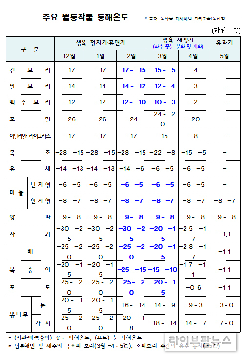 이와관련 농식품부 관계자는 “최근 3년간 농작물 이상저온 피해가 지속 발생한 점을 감안, 철저한 사전 대비가 필요하다”고 강조하면서, 농업인들께 과수, 인삼, 채소 등 작물별 대비사항을 적극 실천하여 피해예방에 힘써 줄 것을 당부했다.