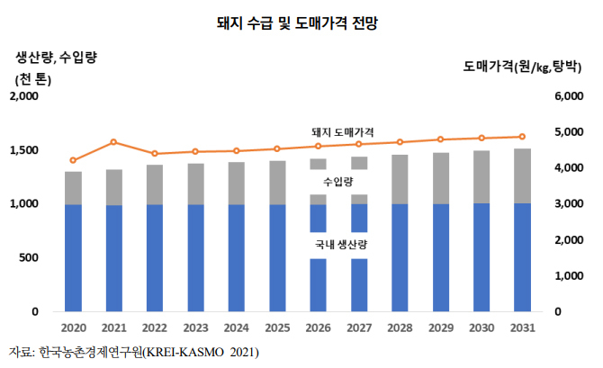 2022년 돼지 도매가격은 등급 판정 마릿수, 수입량 증가에 따른 국내 공급량 증가로 2021년(4,722원) 대비 하락한 4,300~4,500원/kg으로 예상된다.