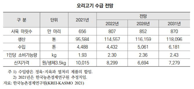 2022년 오리 산지 가격은 육용오리 사육 마릿수 증가 영향으로 2021년 대비 하락한 생체 3.5kg당 8,000원 내외로 전망된다.