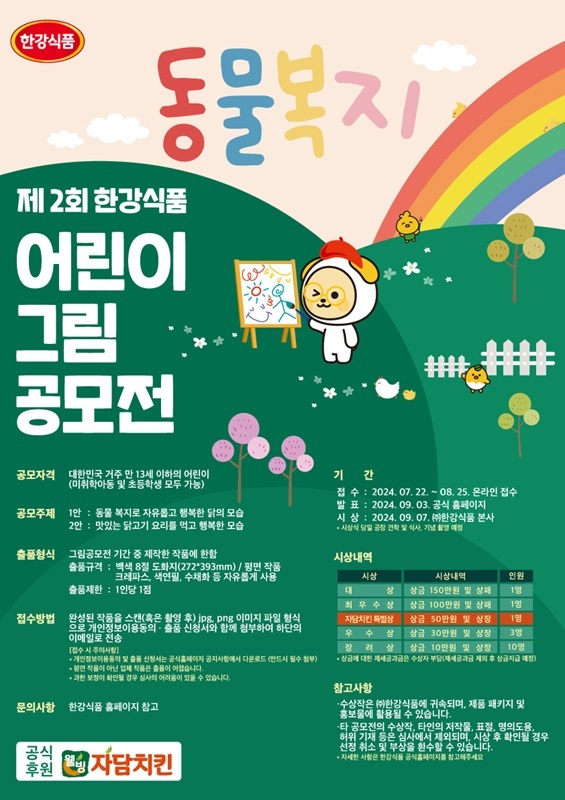한강식품 관계자는 “이번 공모전은 동물복지를 통해 건강하고 안전한 먹거리를 앞으로 확산해 나가고자 하는 의미로 동물복지 브랜드 자담치킨이 공식 후원했다”며, “본 공모전을 통해 어린이들이 동물복지에 대해 생각하고 고민하며 창의력을 마음껏 표출하는 기회가 되길 바란다”고 밝혔다.