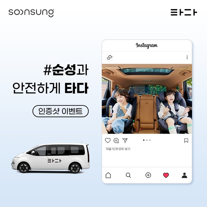 본 이벤트는 영유아의 안전한 차량 이동의 공통된 가치를 실현하고자 8월초 진행되었던 ‘엄마아빠타다’ 이벤트의 연장선으로, 타다 택시에 설치된 순성 ‘우노’ 카시트의 자녀 탑승 인증샷을 개인 인스타그램에 게재하는 이벤트이다.