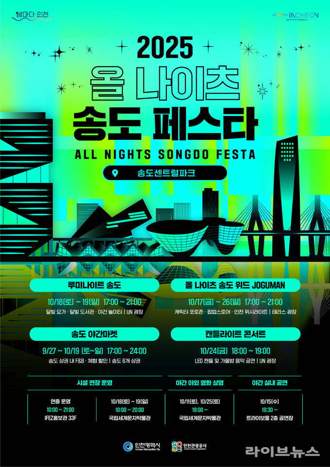 인천시(시장 유정복)와 인천관광공사(사장 백현)는 오는 17일부터 26일까지 송도센트럴파크 일대에서 2025 올 나이츠 송도 페스타를 개최한다고 13일 밝혔다.