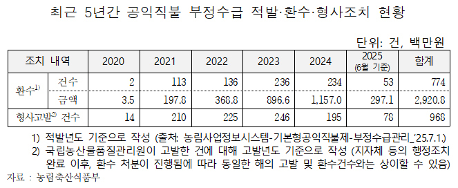 한편, 공익직불금 부정수급과 관련한 형사고발 건수도 2020년 14건, 2021년 210건, 2022년 225건, 2023년 246건, 2024년 195건, 2025년 6월 기준 78건으로 증가하는 등 5년여간 총 968건으로 나타났다.
