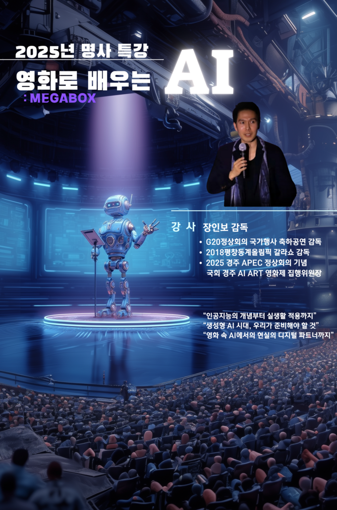 오는 10월 31일 오후 4시, 메가박스 하남미사점에서 ‘영화로 보는 AI 스페셜 강연’이 열린다. 국회 AI ART 영화제와 미사음악영화제 집행위원장을 맡고 있는 장인보 감독이 진행하는 이번 강연은 국내 영화관 최초로 시도되는 AI 인문학 강연으로, 대형 스크린과 서라운드 사운드를 통해 관객을 인공지능(AI)의 세계로 초대한다.