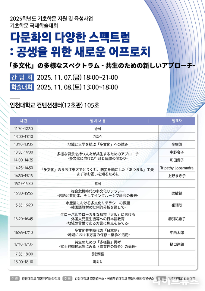 인천대학교 일본연구소(소장 이호상)는 오는 11월 8일 오후 1시, 인천대학교 컨벤션센터(12호관)에서 다문화의 다양한 스펙트럼: 공생을 위한 새로운 어프로치를 주제로 국제학술대회를 개최한다.
