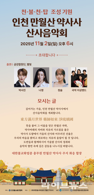 이번 음악회는 인천시가 후원하고 인천불교총연합회가 주최, 약사사가 주관하는 행사로, 도심 속 사찰을 문화무대로 확장해 시민들이 함께 즐길 수 있는 열린 힐링 축제로 기획됐다.
