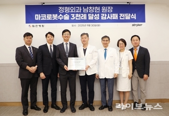 한국스트라이커(대표 심현우)는 힘찬병원이 지난 2020년 마코로봇 시스템을 선도적으로 도입한 후, 남창현 의무원장이 최근 3,000례 이상을 시행하며 로봇 수술기를 이용한 인공관절 수술의 우수성을 알린 공로를 인정해 이번 감사패를 수여했다고 밝혔다.