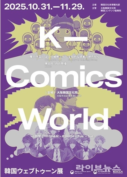 주오사카한국문화원(원장 김혜수, 이하 문화원)은 10월 31일(금)부터 11월 29일(토)까지 문화원 미리내 갤러리에서 ‘케이-코믹스 월드(Comics World)’ 전시를 개최한다. 한국 웹툰이 지닌 문화 콘텐츠로서의 가치와 확장성을 알리기 위해 5개국 문화원에서 개최되는 전시로 문화체육관광부(장관 최휘영)가 주최하고 문화원과 한국콘텐츠진흥원(원장직무대행 유현석)이 주관한다.