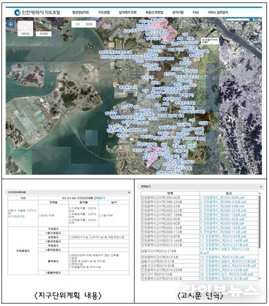 이번에 구축된 온라인 서비스에서는 인천시 지도포털에 접속해 주소나 위치를 입력하면 해당 지역의 지번·지목·면적 등 기본정보뿐 아니라 지구단위계획구역, 건축물 용도, 건폐율, 용적률, 높이 등 세부정보를 한눈에 확인할 수 있다.