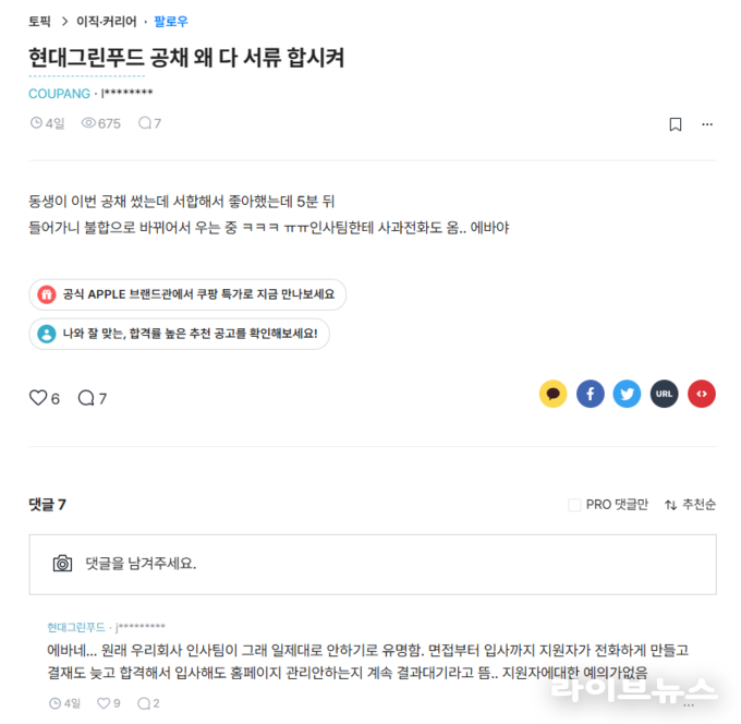 커뮤니티에서는 “입사 과정에서도 지원자를 존중하지 않는 태도”라며 인사팀의 관리 부실을 지적하는 댓글이 이어졌다.