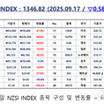 언론 통합 플랫폼이자 인터넷신문사 제보팀장을 운영 중인 더에이아이미디어는 9월 17일 NZSI INDEX 기반 시황 보고서를 발표했다. [편집자주] NZSI INDEX는 왜곡된 시장 정보에서 벗어나, 개인 투자자를 위한 공정하고 실질적인 투자 기준을 제시합니다. NZSI INDEX에는 미래를 설계할 수 있는 자본시장의 가능성이 담겨 있습니다. ★ 지수변경 : 1,000을 기준으로 종목 기여도 동일 반영 ★ 기 준 가 : 2024. 12. 20 / 1차 개편 : 2025. 04. 01 ★ 평가기준 : 20개 종목 X 5개 항목 (건전성, 안전성, 성장성, 위험도, 기대값) X 10등급 (A3 ~ D) 2025년 9월 17일, 국내 증시는 숨고르기 국면에 접어든 모습이었다. 코스피는 전 거래일 대비 1.05% 하락해 3,413.40포인트로 마감했으며, 코스닥 역시 0.74% 내린 845.53포인트를 기록했다. 거래대금은 코스피 약 10조 9천억 원, 코스닥 약 6조 6천억 원으로 전일과 유사했고, 시가총액은 코스피 2,790조 6천억 원, 코스닥 438조 7천억 원 수준이었다. 뉴욕 증시에서는 다우존스 산업평균지수가 0.57% 상승한 46,018.32포인트로 마