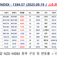 언론 통합 플랫폼이자 인터넷신문사 제보팀장을 운영 중인 더에이아이미디어는 9월 19일 NZSI INDEX 기반 시황 보고서를 발표했다. [편집자주] NZSI INDEX는 왜곡된 시장 정보에서 벗어나, 개인 투자자를 위한 공정하고 실질적인 투자 기준을 제시합니다. NZSI INDEX에는 미래를 설계할 수 있는 자본시장의 가능성이 담겨 있습니다. ★ 지수변경 : 1,000을 기준으로 종목 기여도 동일 반영 ★ 기 준 가 : 2024. 12. 20 / 1차 개편 : 2025. 04. 01 ★ 평가기준 : 20개 종목 X 5개 항목 (건전성, 안전성, 성장성, 위험도, 기대값) X 10등급 (A3 ~ D) 국내 증시는 혼조세 속에서도 코스닥이 반등하고 코스피는 소폭 약세로 마감했다. 코스피는 전날 대비 0.46% 하락한 3,445.24포인트를 기록했고, 코스닥은 0.70% 상승한 863.11포인트로 장을 마쳤다. 거래대금은 코스피 약 11조 원, 코스닥 약 6조 6천억 원 수준으로 전일 대비 다소 증가했고, 시가총액은 코스피 2,816조 9천억 원, 코스닥 448조 2천억 원로 집계됐다. 뉴욕 증시에서는 강세 흐름이 이어졌다. 다우존스 산업평균지수는 0.37% 상승