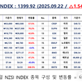 언론 통합 플랫폼이자 인터넷신문사 제보팀장을 운영 중인 더에이아이미디어는 9월 22일 NZSI INDEX 기반 시황 보고서를 발표했다. [편집자주] NZSI INDEX는 왜곡된 시장 정보에서 벗어나, 개인 투자자를 위한 공정하고 실질적인 투자 기준을 제시합니다. NZSI INDEX에는 미래를 설계할 수 있는 자본시장의 가능성이 담겨 있습니다. ★ 지수변경 : 1,000을 기준으로 종목 기여도 동일 반영 ★ 기 준 가 : 2024. 12. 20 / 1차 개편 : 2025. 04. 01 ★ 평가기준 : 20개 종목 X 5개 항목 (건전성, 안전성, 성장성, 위험도, 기대값) X 10등급 (A3 ~ D) 2025년 9월 22일, 국내 증시는 다시 반등 흐름으로 돌아섰다. 코스피는 전일 대비 0.68% 상승해 3,468.65포인트를 기록했고, 코스닥은 1.30% 오른 874.36포인트로 장을 마쳤다. 거래대금은 코스피 약 11조 원, 코스닥 약 6조 6천억 원 수준으로 전일과 유사했고, 시가총액은 코스피 2,837조 9천억 원, 코스닥 454조 1천억 원로 집계됐다. 뉴욕 증시도 온건한 상승 흐름을 보였다. 다우존스 산업평균지수는 0.14% 오른 46,381.54포