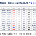 언론 통합 플랫폼이자 인터넷신문사 제보팀장을 운영 중인 더에이아이미디어는 9월 23일 NZSI INDEX 기반 시황 보고서를 발표했다. [편집자주] NZSI INDEX는 왜곡된 시장 정보에서 벗어나, 개인 투자자를 위한 공정하고 실질적인 투자 기준을 제시합니다. NZSI INDEX에는 미래를 설계할 수 있는 자본시장의 가능성이 담겨 있습니다. ★ 지수변경 : 1,000을 기준으로 종목 기여도 동일 반영 ★ 기 준 가 : 2024. 12. 20 / 1차 개편 : 2025. 04. 01 ★ 평가기준 : 20개 종목 X 5개 항목 (건전성, 안전성, 성장성, 위험도, 기대값) X 10등급 (A3 ~ D) 2025년 9월 23일, 국내 증시는 혼조세를 보였다. 코스피는 전 거래일 대비 0.51% 상승한 3,486.19포인트로 마감했지만, 코스닥은0.25% 하락한 872.21포인트로 장을 마쳤다. 거래대금은 코스피 약 11조 원, 코스닥 약 6조 7천억 원 수준으로 전일 대비 소폭 확대되었고, 시가총액은 코스피 2,852조 4천억 원, 코스닥 453조 1천억 원으로 집계되었다. 글로벌 시장에서는 다우존스 산업평균지수가 0.19% 하락한 46,292.78포인트로, 나스