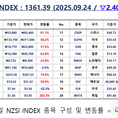 언론 통합 플랫폼이자 인터넷신문사 제보팀장을 운영 중인 더에이아이미디어는 9월 24일 NZSI INDEX 기반 시황 보고서를 발표했다. [편집자주] NZSI INDEX는 왜곡된 시장 정보에서 벗어나, 개인 투자자를 위한 공정하고 실질적인 투자 기준을 제시합니다. NZSI INDEX에는 미래를 설계할 수 있는 자본시장의 가능성이 담겨 있습니다. ★ 지수변경 : 1,000을 기준으로 종목 기여도 동일 반영 ★ 기 준 가 : 2024. 12. 20 / 1차 개편 : 2025. 04. 01 ★ 평가기준 : 20개 종목 X 5개 항목 (건전성, 안전성, 성장성, 위험도, 기대값) X 10등급 (A3 ~ D) 2025년 9월 24일, 국내 증시는 하락세로 전환되었다. 코스피 지수는 전 거래일 대비 0.40% 내린 3,472.14포인트를 기록했고, 코스닥 지수는 1.29% 하락한 860.94포인트로 장을 마감했다. 거래대금은 코스피 약 11조 원, 코스닥 약 6조 7천억 원 수준으로 전일과 유사한 수준을 보였고, 시가총액은 코스피 2,841조 원, 코스닥 447조 5천억 원으로 집계되었다. 글로벌 시장에서도 동반 약세 흐름이 계속됐다. 미국 뉴욕 증시에서 다우존스 산업평