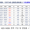 언론 통합 플랫폼이자 인터넷신문사 제보팀장을 운영 중인 더에이아이미디어는 9월 9일 NZSI INDEX 기반 시황 보고서를 발표했다. [편집자주] NZSI INDEX는 왜곡된 시장 정보에서 벗어나, 개인 투자자를 위한 공정하고 실질적인 투자 기준을 제시합니다. NZSI INDEX에는 미래를 설계할 수 있는 자본시장의 가능성이 담겨 있습니다. ★ 지수변경 : 1,000을 기준으로 종목 기여도 동일 반영 ★ 기 준 가 : 2024. 12. 20 / 1차 개편 : 2025. 04. 01 ★ 평가기준 : 20개 종목 X 5개 항목 (건전성, 안전성, 성장성, 위험도, 기대값) X 10등급 (A3 ~ D) 2025년 9월 9일, 국내 증시는 6거래일 연속 상승하는 흐름을 보였다. 코스피 지수는 전 거래일 대비 1.26% 오르며 3,260.05포인트로, 코스닥 지수는 824.82포인트(+0.76%)로 장을 마쳤다. 거래대금은 코스피 약 10조 9천억 원, 코스닥 약 6조 6천억 원으로 규모는 전일과 크게 차이가 없었다. 시가총액은 코스피 2,664조 9천억 원, 코스닥 427조 9천억 원 수준이었다. 외국인과 기관이 순매수 주체로 부상하며 반도체와 금융주가 상승을 주도