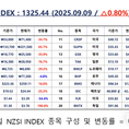 언론 통합 플랫폼이자 인터넷신문사 제보팀장을 운영 중인 더에이아이미디어는 9월 8일 NZSI INDEX 기반 시황 보고서를 발표했다. [편집자주] NZSI INDEX는 왜곡된 시장 정보에서 벗어나, 개인 투자자를 위한 공정하고 실질적인 투자 기준을 제시합니다. NZSI INDEX에는 미래를 설계할 수 있는 자본시장의 가능성이 담겨 있습니다. ★ 지수변경 : 1,000을 기준으로 종목 기여도 동일 반영 ★ 기 준 가 : 2024. 12. 20 / 1차 개편 : 2025. 04. 01 ★ 평가기준 : 20개 종목 X 5개 항목 (건전성, 안전성, 성장성, 위험도, 기대값) X 10등급 (A3 ~ D) 2025년 9월 8일, 국내 증시는 5거래일 연속 상승세를 이어갔다. 코스피 지수는 전 거래일 대비 0.45% 오른 3,219.59포인트로 마감했고, 코스닥 지수는 0.89% 상승한 818.60포인트를 기록하며 동반 강세를 보였다. 거래대금은 코스피 약 10조 9천억 원, 코스닥 약 6조6천억 원으로 전일과 큰 차이는 없었고, 시가총액은 코스피 2,631조 3천억 원, 코스닥 424조 5천억 원으로 나타났다. 해외 증시는 연방준비제도의 금리 인하 기대감에 힘입어 안