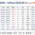 언론 통합 플랫폼이자 인터넷신문사 제보팀장을 운영 중인 더에이아이미디어는 8월 12일 NZSI INDEX 기반 시황 보고서를 발표했다. [편집자주] NZSI INDEX는 왜곡된 시장 정보에서 벗어나, 개인 투자자를 위한 공정하고 실질적인 투자 기준을 제시합니다. NZSI INDEX에는 미래를 설계할 수 있는 자본시장의 가능성이 담겨 있습니다. ★ 지수변경 : 1,000을 기준으로 종목 기여도 동일 반영 ★ 기 준 가 : 2024. 12. 20 / 1차 개편 : 2025. 04. 01 ★ 평가기준 : 20개 종목 X 5개 항목 (건전성, 안전성, 성장성, 위험도, 기대값) X 10등급 (A3 ~ D) 2025년 8월 12일, 국내 증시는 내림세를 보였다. 코스피 지수는 전 거래일 대비 0.53% 하락한 3,189.91포인트로 마감하며 약세를 나타냈다. 코스닥 지수도 0.65% 내린 807.19포인트로 장을 마쳤다. 유가증권시장의 거래대금은 약 11조 1천억 원, 코스닥 시장은 약 6조 7천억 원으로 전일과 비슷한 수준을 유지했다. 시가총액은 코스피 2,606조 4천억 원, 코스닥 415조 원으로 집계됐다. 글로벌 증시 다우존스 산업평균지수는 전일 대비 1.10