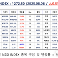 언론 통합 플랫폼이자 인터넷신문사 제보팀장을 운영 중인 더에이아이미디어는 8월 6일 NZSI INDEX 기반 시황 보고서를 발표했다. [편집자주] NZSI INDEX는 왜곡된 시장 정보에서 벗어나, 개인 투자자를 위한 공정하고 실질적인 투자 기준을 제시합니다. NZSI INDEX에는 미래를 설계할 수 있는 자본시장의 가능성이 담겨 있습니다. ★ 지수변경 : 1,000을 기준으로 종목 기여도 동일 반영 ★ 기 준 가 : 2024. 12. 20 / 1차 개편 : 2025. 04. 01 ★ 평가기준 : 20개 종목 X 5개 항목 (건전성, 안전성, 성장성, 위험도, 기대값) X 10등급 (A3 ~ D) 2025년 8월 6일, 국내 증시는 상승세를 이어갔다. 코스피 지수는 전 거래일 대비 사실상 변동 없이 3,198.14포인트로 마감했고, 코스닥 지수는 0.61% 상승한 803.49포인트로 800선을 돌파하며 견조한 흐름을 이어갔다. 시장에서는 반도체 업종 일부가 약세를 보인 반면, 제약•바이오와 2차전지 관련주 중심으로 매수세가 유입되며 코스닥 상승을 견인했다. 유가증권시장의 거래대금은 약 11조 1천억 원, 코스닥 시장은 약 6조 7천억 원으로 집계돼 전일보다